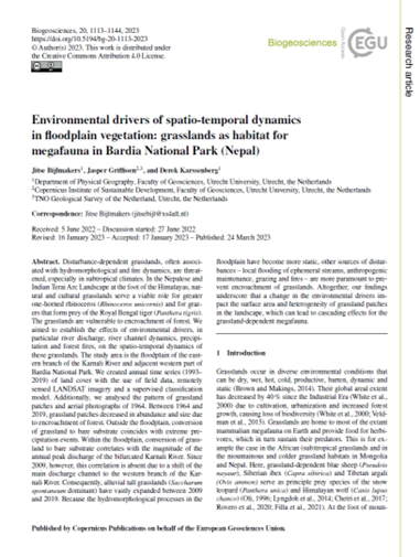 Bijlmakers, J., Griffioen, J., and Karssenberg, D.: Environmental drivers of spatio-temporal dynamics in floodplain vegetation: grasslands as habitat for megafauna in Bardia National Park (Nepal), Biogeosciences, 20, 1113–1144, https://doi.org/10.5194/bg-20-1113-2023.